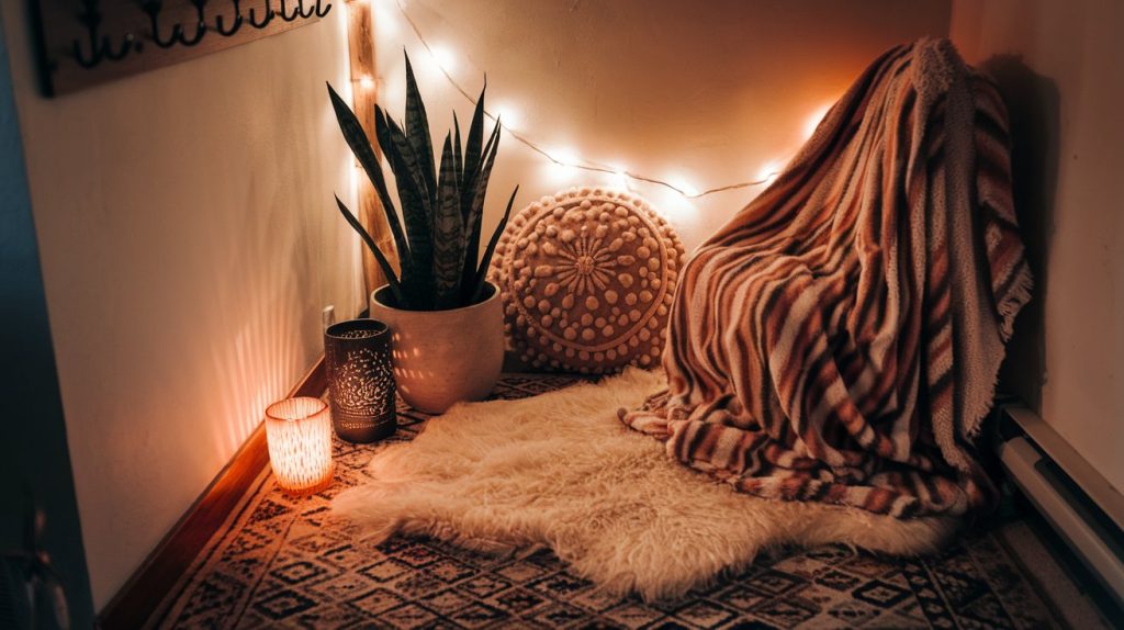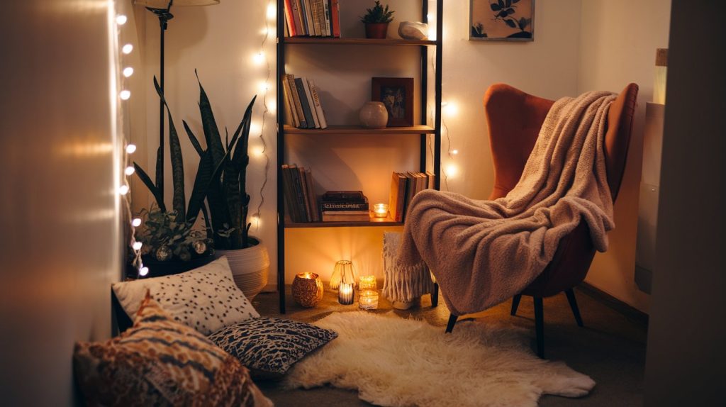 Un colț cozy nu ar fi complet fără o paletă bogată de texturi care să invite la atingere și relaxare. Pernele pufoase, pledurile moi și covoarele cu fire groase creează o atmosferă tactilă ce îmbrățișează sufletul. Dacă locuiești într-un spațiu mic, poți alege piese multifuncționale, cum ar fi un fotoliu tapițat cu un mic depozit, care să adauge și utilitate, nu doar confort.